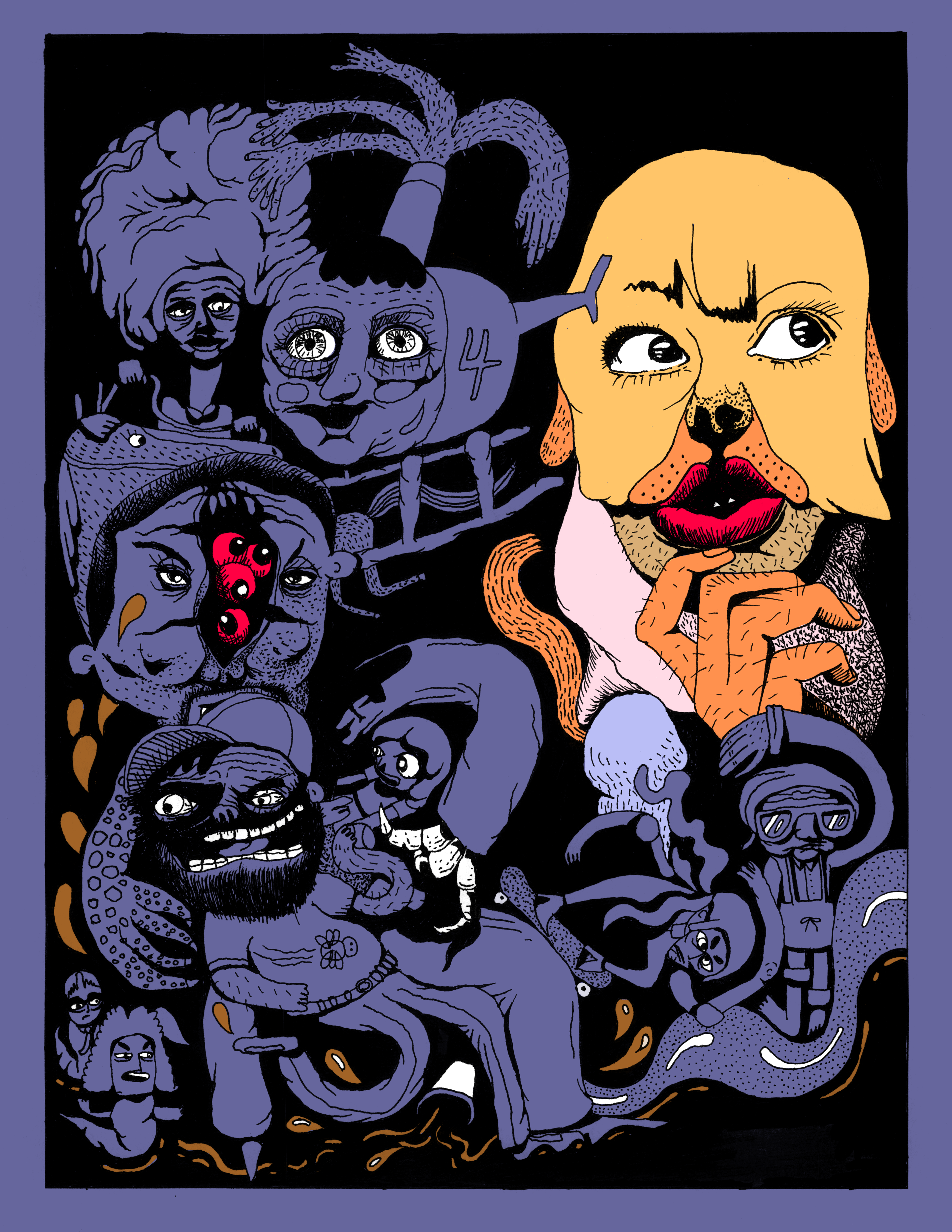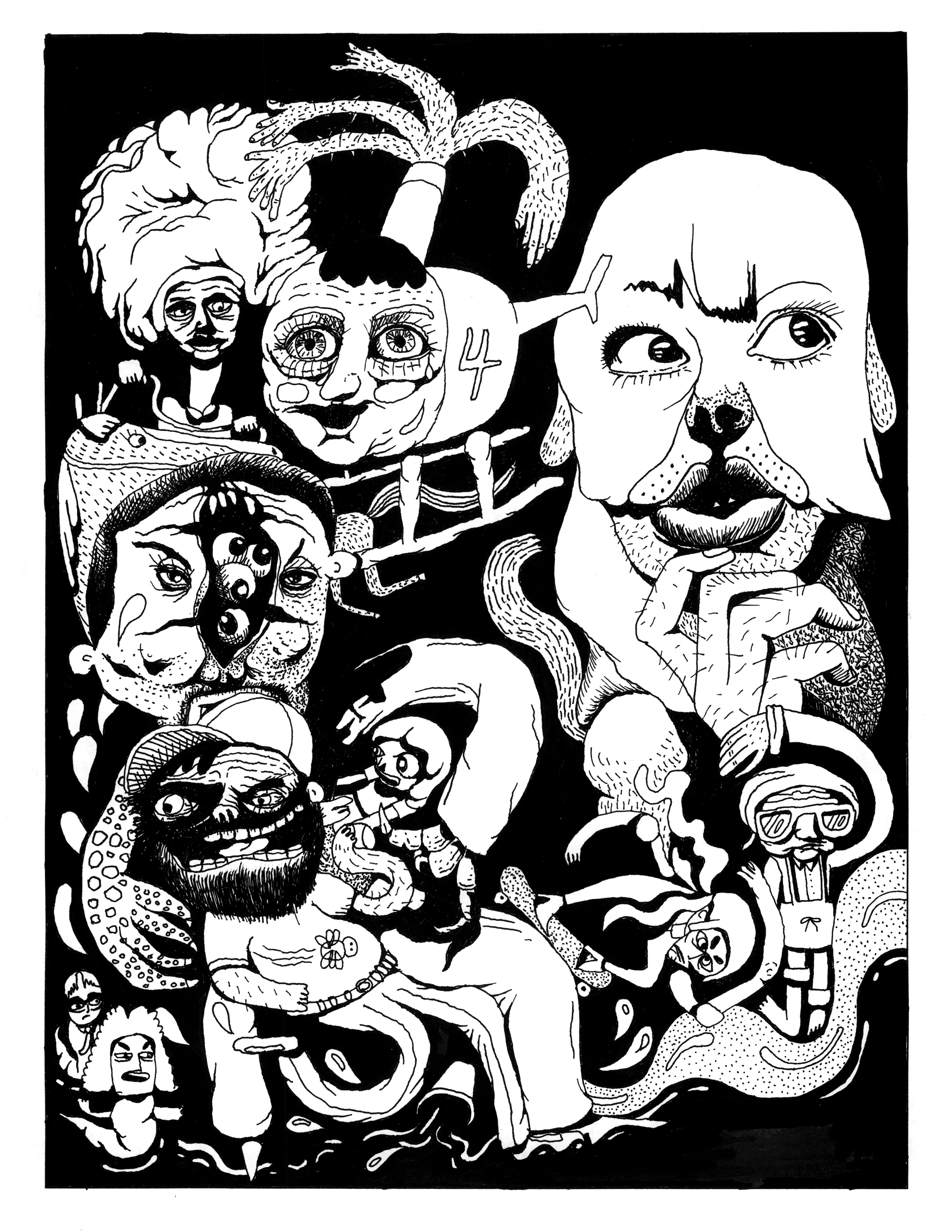 Key art for Hellavision Television Network's upcoming animated special, "Janice's Secret". Character designs provided by HTN, but seen here pushed/drawn in my style. Drawn with a Rapidograph 00 on paper, then scanned. Cleanup and color in Photoshop.