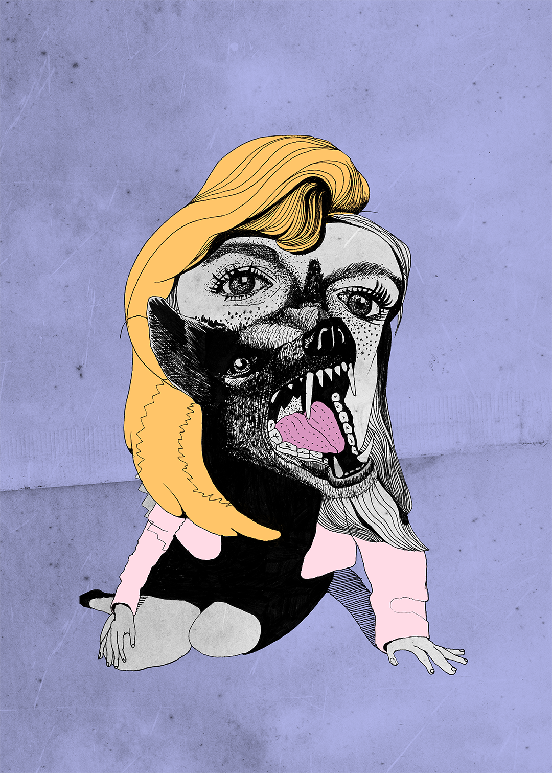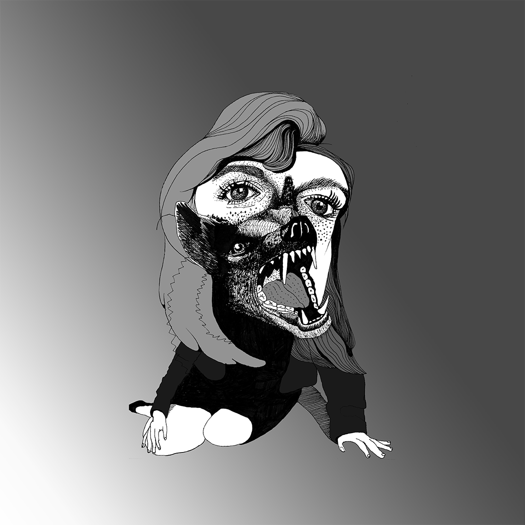 Key art for Hellavision Television Network's upcoming animated werewolf workplace comedy, "Janice's Secret". Drawn with a Rapidograph 00 on paper, then scanned. Cleanup, color and texture in Photoshop.